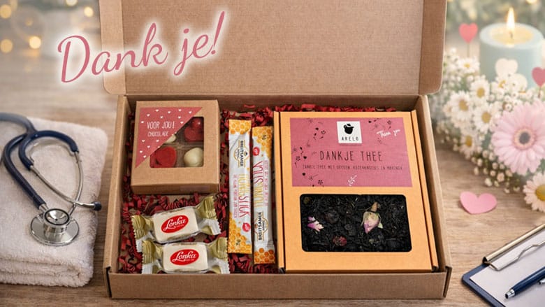 Warm brievenbus cadeau met thee, chocolade en honing. Mooie blijk van waardering voor zorgmedewerkers