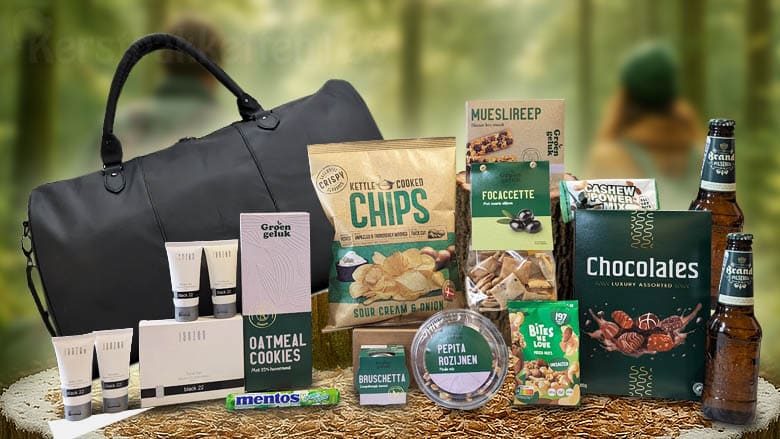 Dit groene reispakket met luxe reistas, Janzen travelset en heerlijke lekkernijen is perfect als kerstpakket of relatiegeschenk.