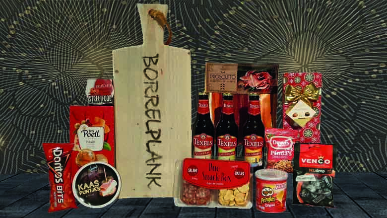 De tafel word volgeladen met allerlei lekkers zoals Pringles, Pinda’s van Duyvis, Doritos en een Duo snackbox. Bonbons en Venco NL drop is goed voor de zoete trek. De kaaspuntjes en bruschetta smaken heerlijk op de krokante toast, terwijl een opgerold stukje Seranoham het goed doet bij een Texelse biertje. Met dit borrelplankje sla je geheid de plank niet mis!